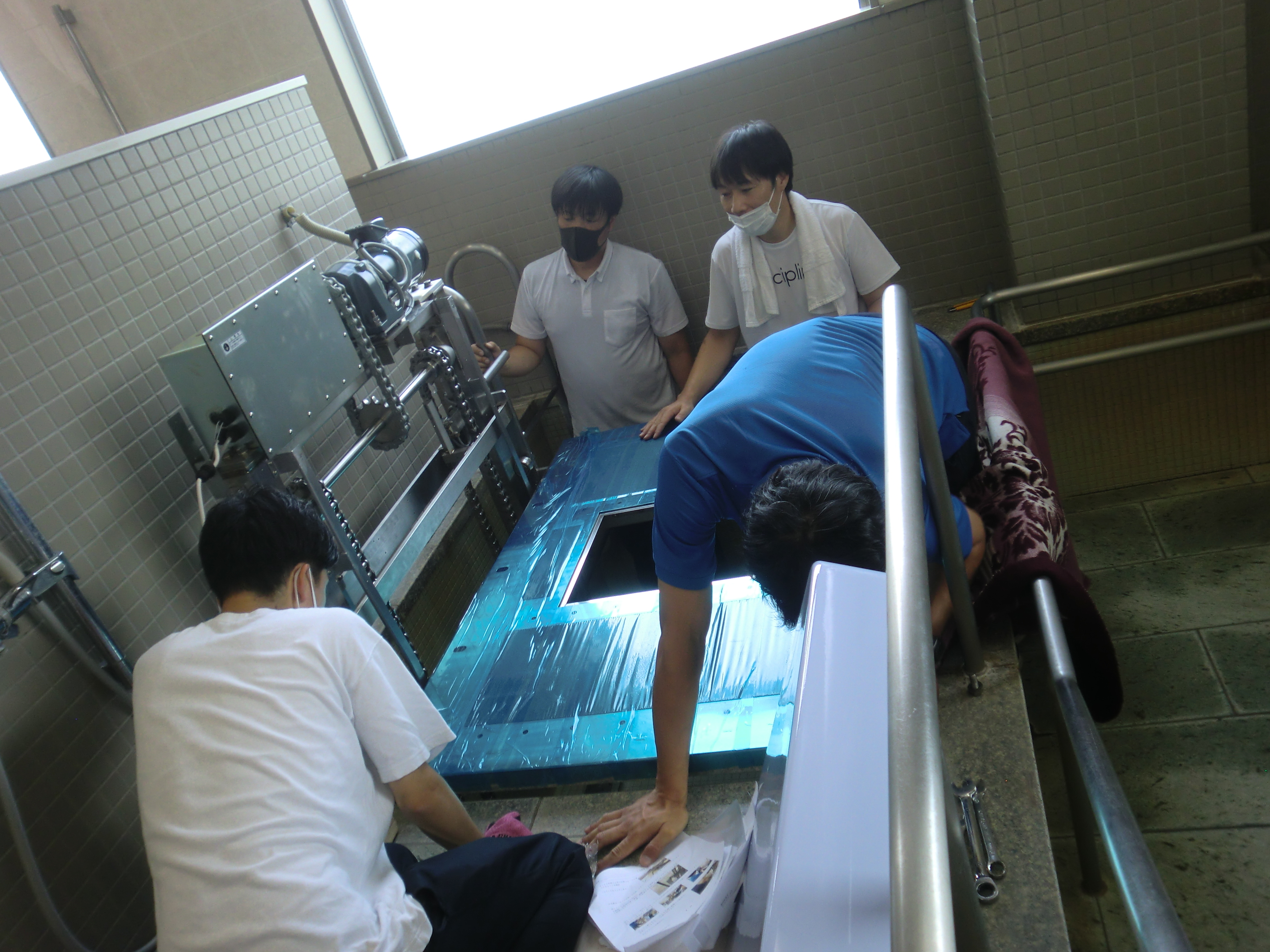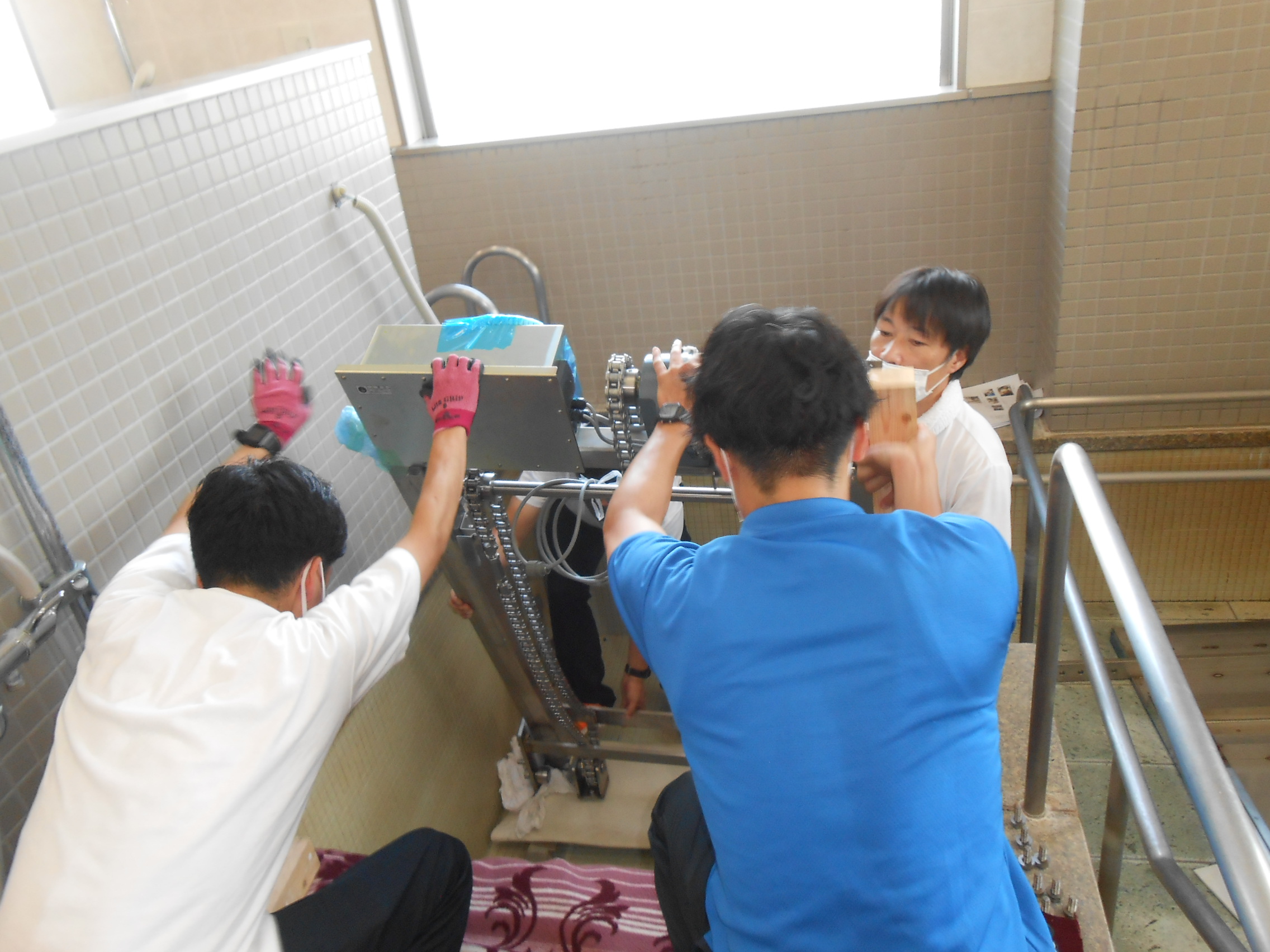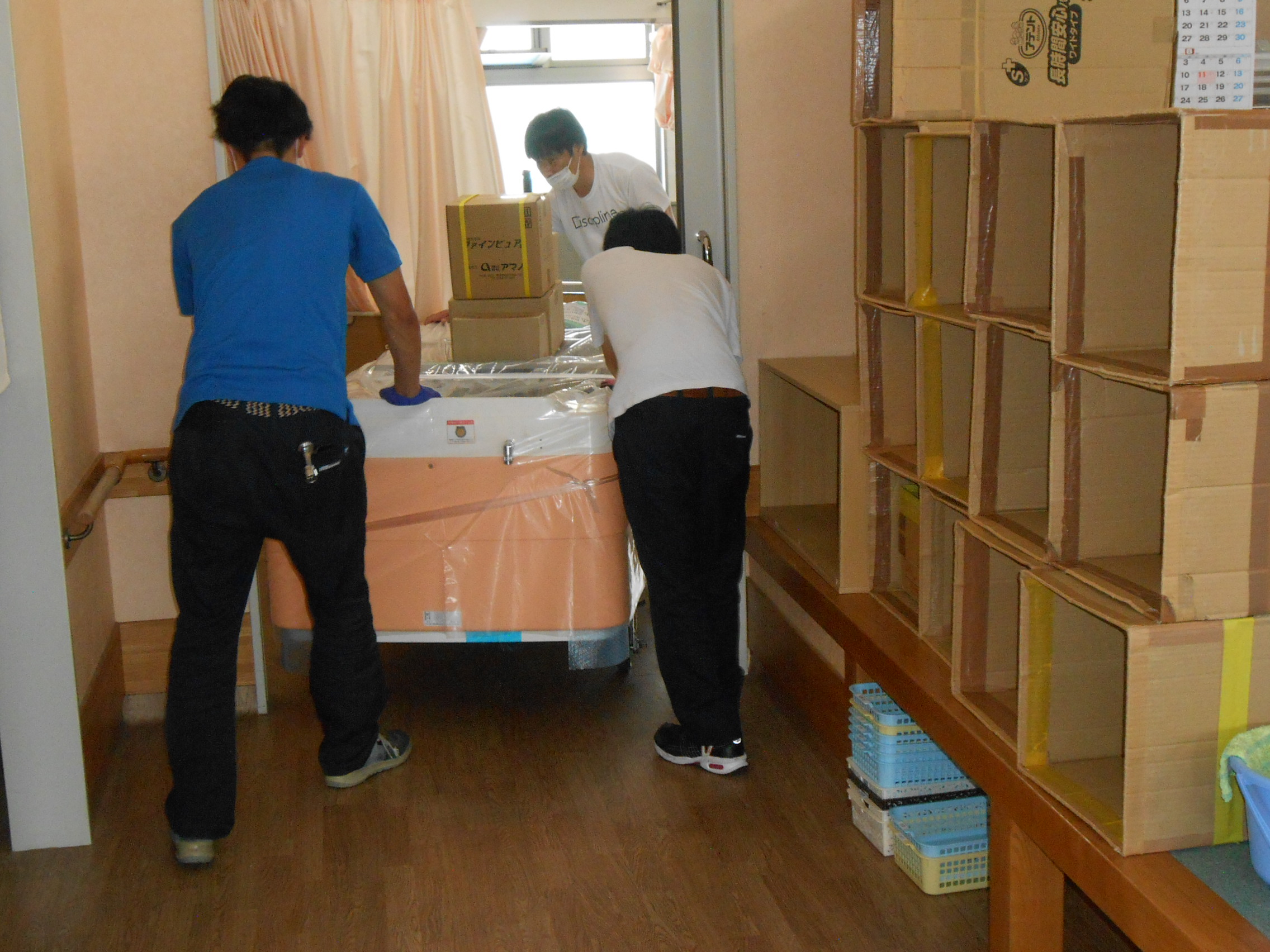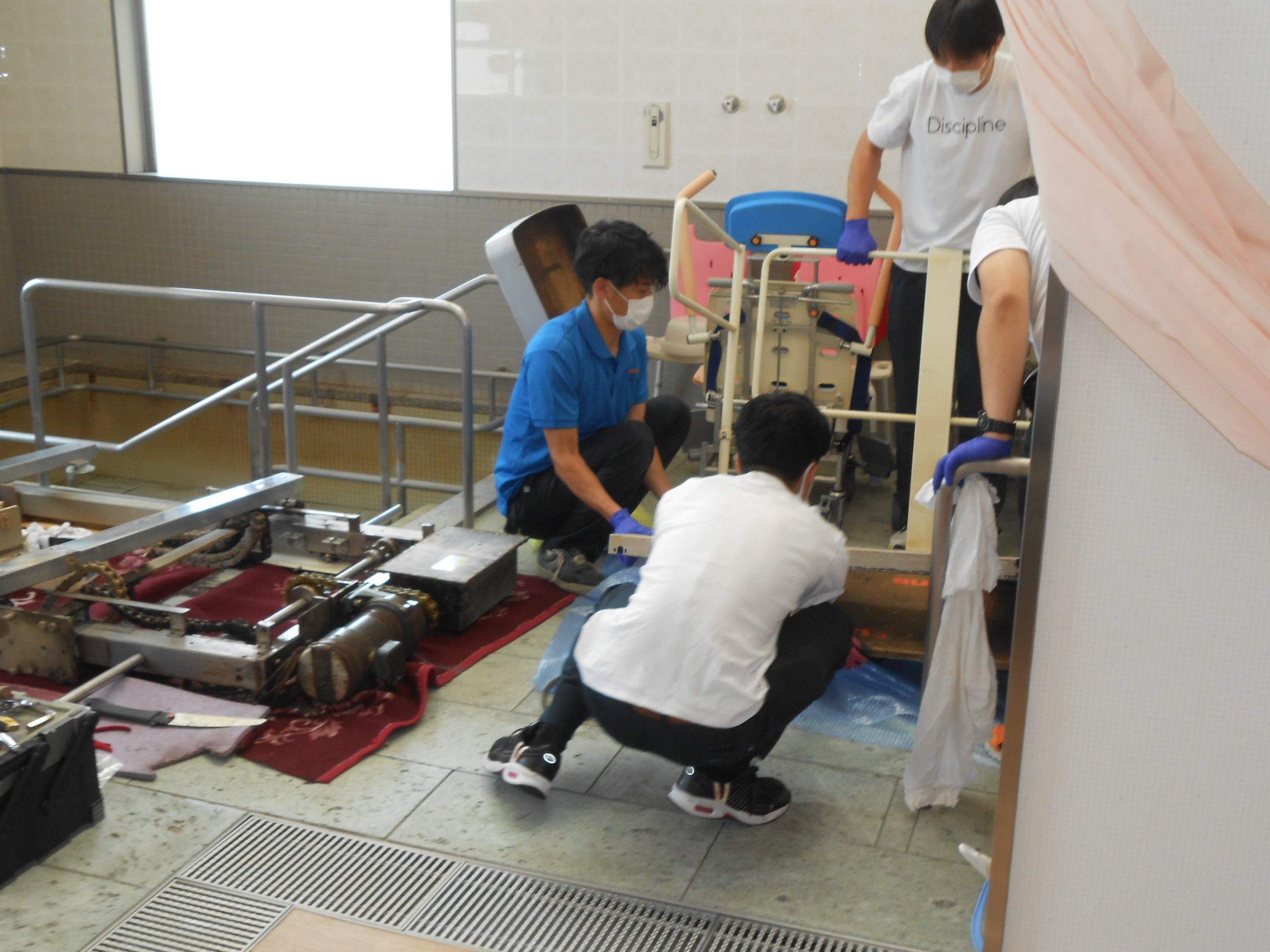 わらしべの特殊浴槽とリフト浴は17年間仲間たちの入浴を支えてくれました・・・整備や部品の交換など定期的にして大事に使っていた浴槽でした。その浴槽も老朽化と取り換え部品終了で、安全に入浴できるように交換を考え、「赤い羽根共同募金の助成」を申し込んだところ申請が通り、今回新しい浴槽に取り換えることとなりました。